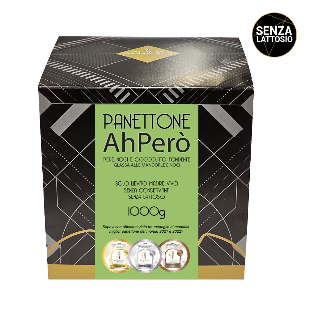 Farina di frumento tipo 0, burro senza lattosio, cioccolato fondente, pere semi candite (pere, sciroppo di glucosio-fruttosio, zucchero), noci, lievito madre (frumento), zucchero, tuorlo d’uovo, miele, scorza di arancia candita (scorza di arancia, sciroppo di glucosio-fruttosio, zucchero), sale, vaniglia del Madagascar in bacche.
