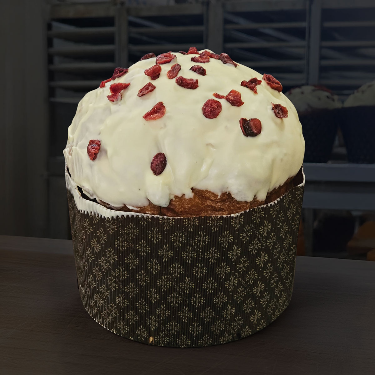 Realizzato con lievito madre VIVO, YOGURT greco bianco, BURRO Belga, miele Sardo, tuorlo d’UOVO Italiano, scorze di arance, Frutti di Bosco Semicanditi, Cioccolato bianco (LATTE), vaniglia del Madagascar
